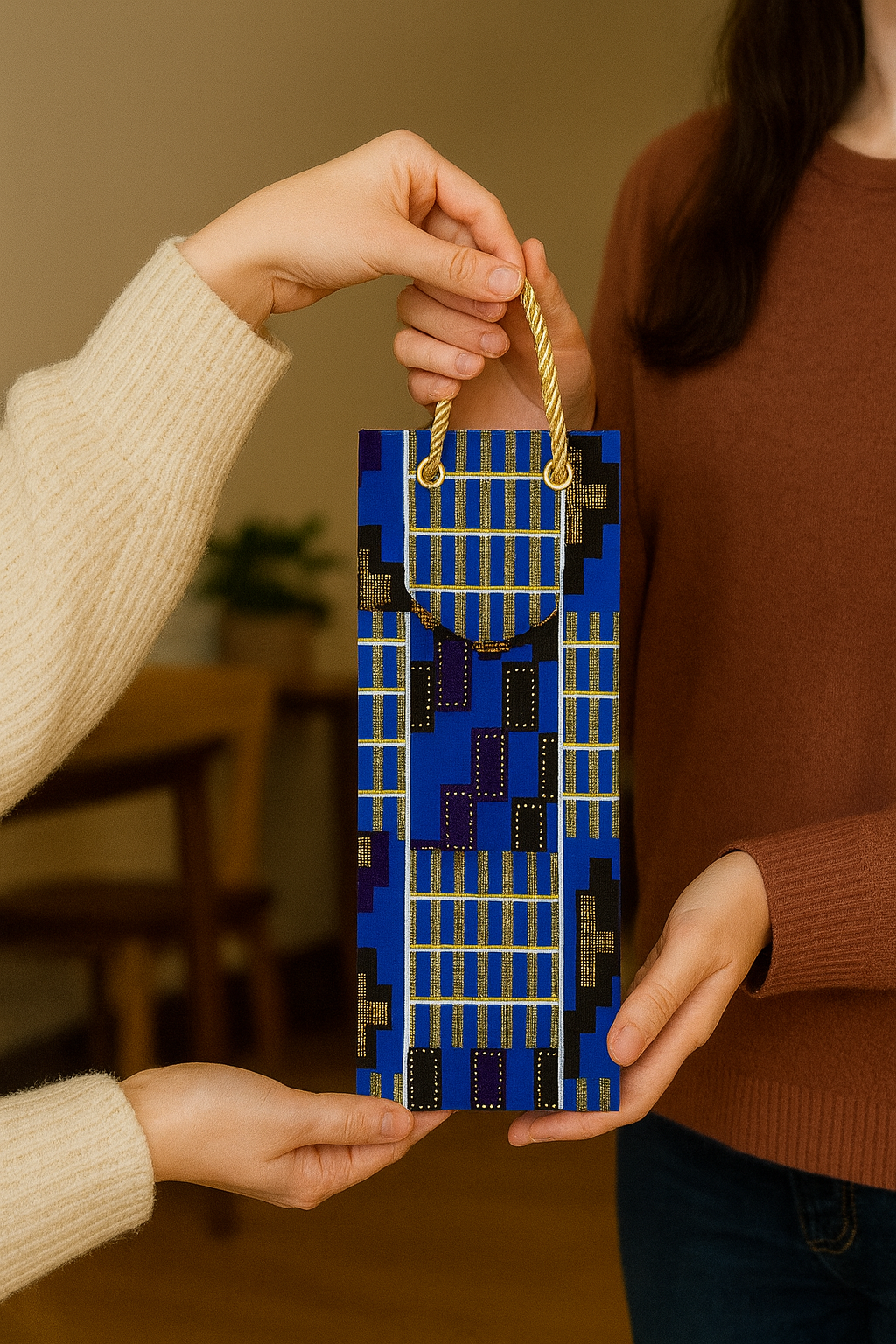 Ethnic, Fabric, Patterned, Handmade Blue, Black, White, and Gold Wine Gift Bag